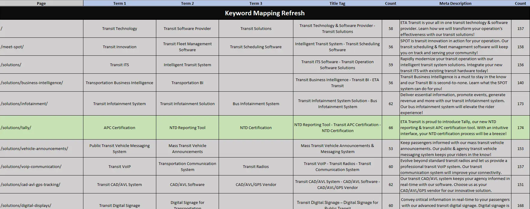 ETA has a unique position in the transit industry, combining the power of their cloud-native software offerings with engineering and integration of legacy hardware. That value proposition, innovation combined with reliability, became the north star of our messaging. It was vital that we quickly established their extensive functionality, deep expertise, and incredible customer support that sets them apart. This initial review and SEO foundation included: